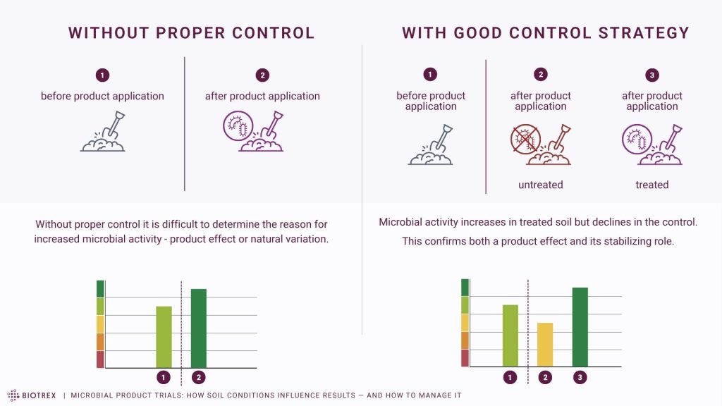 Without this spatial control, it becomes difficult to determine whether observed changes are driven by the product or simply reflect natural fluctuations. Soil microbial communities are inherently dynamic, continuously responding to weather, plant development, and management practices. Without proper controls, any measured change lacks clear context.